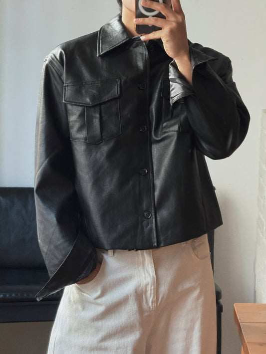 低調光澤感!植物性純素寬鬆短皮褸|2色入